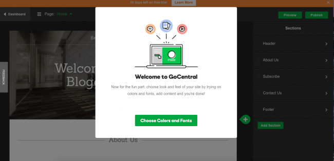 Once you’ve played around and found a template and picture that you like, you can begin to fill in the information to flesh out your site. You will be lead through the process and GoCentral Website Builder explains what each section’s purpose is.
