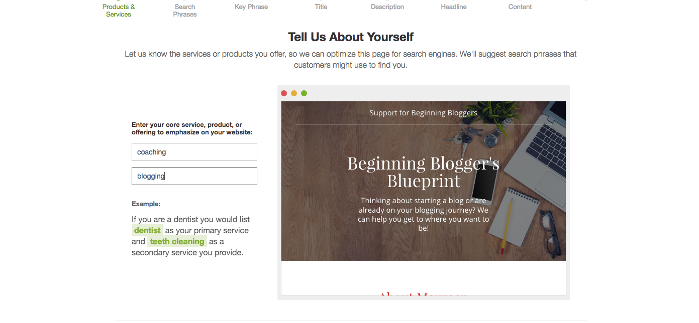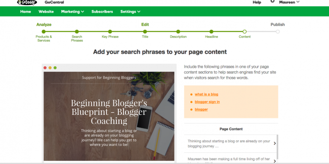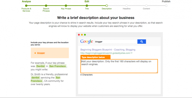 What I really love about the platform is that it walks you through the whole process by asking you questions and providing examples. I have a blogging how-to ebook I wrote as well as offer blogging coaching services but have my offerings kind of scattered on a few different websites. I’ve been wanting one site where I can send people to purchase what best fits their needs. I decided to build this site and see if I really could do it in under an hour.