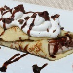 • Spread approximately 1/4 cup of the mixture on the crepe, drizzle with Hershey's syrup and roll the crepe. Add whipped topping and a few grated chocolate pieces to the top. Serve warm and enjoy!