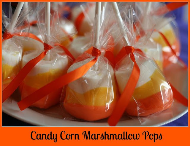 To make the candy corn marshmallow pops, I just dipped jumbo marshmallows in the yellow candy melts, let that harden, and then in the orange candy melts overlapping just a tad. When you put them down to harden, be sure to put them on the uncovered, white side or they will stick to your surface.