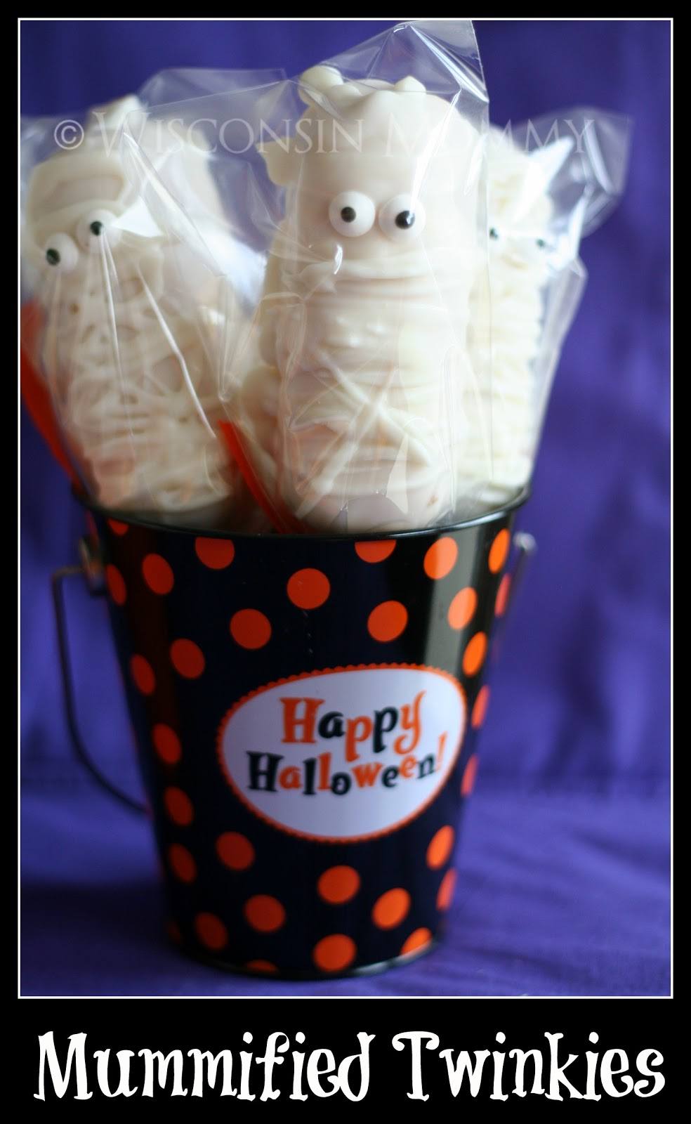 The mummified Twinkie pops were made by freezing the Twinkies first (they will fall apart otherwise) and then coating them with the white candy melts. Let that harden and then drizzle white candy melt back and forth to create the mummy effect. Use extra melt to stick the eyes on.