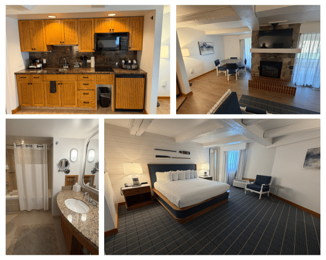 We checked into our Lodges King Suite and were impressed with how spacious and well-furnished it was. It contained a kitchenette that was fully stocked with whatever we might need if we were preparing any food as well as a dinette area. The living room had a fireplace, comfortable seating, and a large slider looking out on a patio with rocking chairs. The suite had two full bathrooms, one with an oversized tub and the other with a multi-nozzle shower. The bedroom had a gorgeous view of the lake and a super comfy king-sized bed.