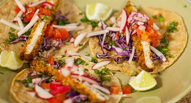 • When ready to serve, place one strip of Tilapia onto each warmed tortilla. Top with Fennel, Napa Cabbage, and Cilantro Slaw and sprinkle with radishes for extra flavor and texture Enjoy!